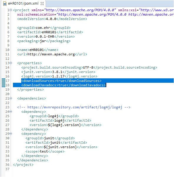 properties에 추가로 소스를 다운받는 것과 javadoc을 다운 받는 기능을 추가한다