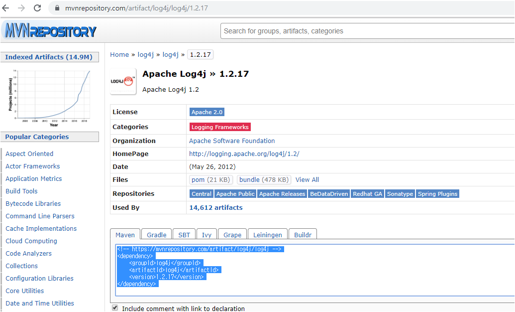 log4j log4j 1.2.17 // https://mvnrepository.com/artifact/log4j/log4j compile group: 'log4j', name: 'log4j', version: '1.2.17' // https://mvnrepository.com/artifact/log4j/log4j libraryDependencies += "log4j" % "log4j" % "1.2.17" // https://mvnrepository.com