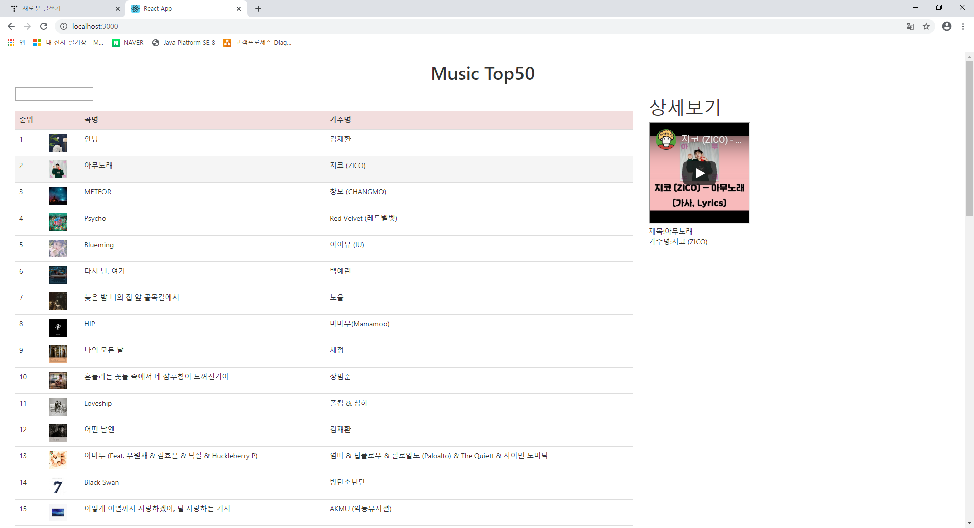 누르는 노래에 맞는 동영상이 옆에 띄어진다.