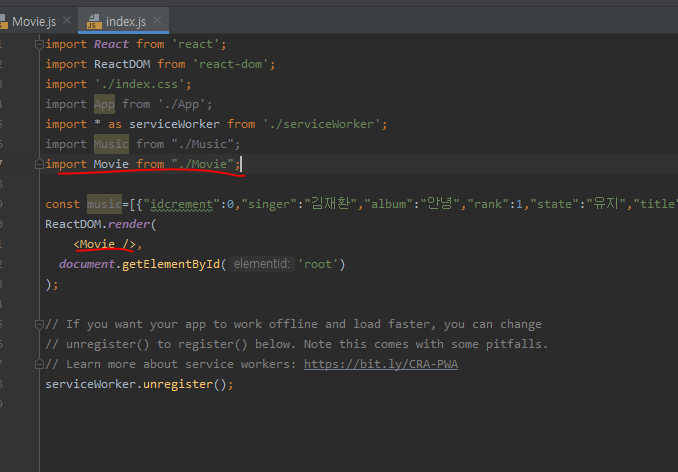 3. 메인인 index.js에다가 movie import 해주고 태그로 호출한다.