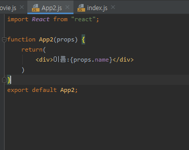 1. index.js에다가 import App2를 해주고 태그로 실행해 준 뒤 name을 넣는다.