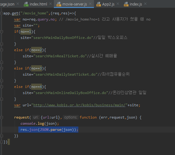 movie-server에서 JSON.parse(json)을 해주면 값이 넘어간다.