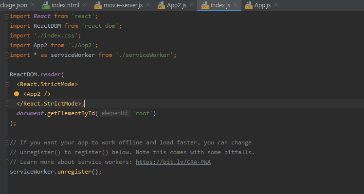 (import 부분이랑 <React.StrictMode> 안에)