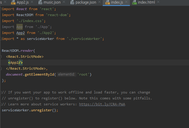 5. index.js에서 App2가 실행되게 적는다.