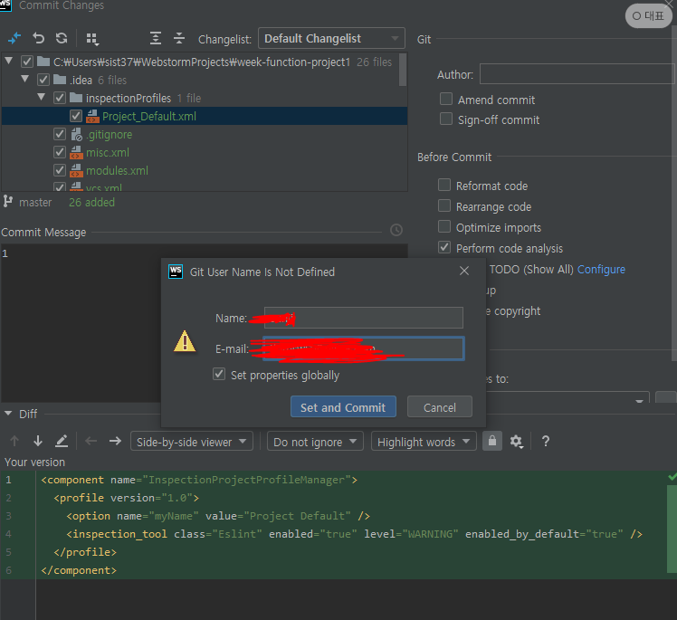 commit and push를 누르고 set and commit을 하면 깃에 올라가 있는 것을 알 수 있다.