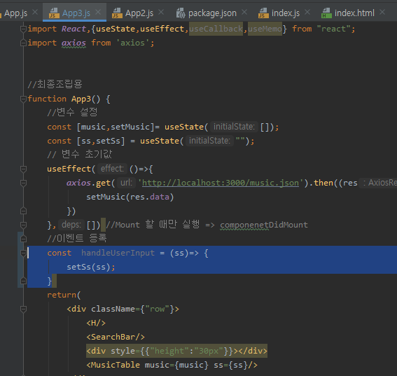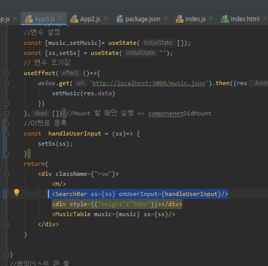 SearchBar에 있는 값을 App3에서 받아서 ss라는 변수로 MusicTable에게 보내고 그 값을 MusicRow로 받아야 한다.(복잡: 단방향이어서)