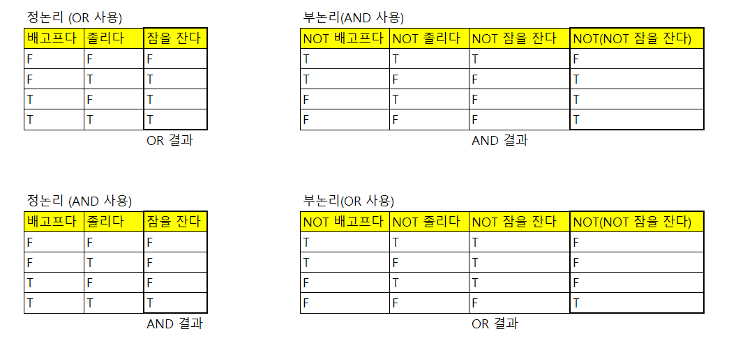 OR을 사용한 정논리와 NOT(AND)를 사용한 부논리가 같다.